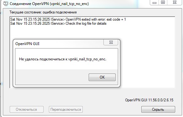 Я вижу, вы столкнулись с ошибкой клиента OpenVPN, связанной с отключением ncp. Обычно это происходит, когда ваша версия клиента OpenVPN не поддерживает определенную опцию в файле конфигурации. Позвольте мне проконсультироваться с помощником по документации VPNKI для правильной настройки клиента OpenVPN, особенно в отношении совместимости с различными версиями клиента OpenVPN и того, как устранить опцию отключения ncp. Это поможет нам устранить ошибку в вашем файле vpnki_nail_tcp_no_enc.ovpn. ─── vpnki_ai_doc_helper | vpnki-mcp ────────────────────────── request_message: настройка клиента OpenVPN для более старых версий, в частности, в отношении опции "ncp-отключить". Сообщение об ошибке "Ошибка настроек: нераспознанный параметр или отсутствуют дополнительные параметры в vpnki_nail_tcp_no_enc.ovpn:5: ncp-disable (2.6.15)" указывает на то, что ваш клиент OpenVPN версии 2.6.15 не распознает или неправильно обрабатывает параметр ncp-disable в вашем конфигурационном файле. Согласно документации VPNKI, параметр --ncp-disable не используется в наших клиентских файлах .ovpn. Эта опция в первую очередь актуальна для старых версий OpenVPN (до версии 2.4) и включена только тогда, когда клиент работает в режиме "двухточечной многоадресной рассылки" (P2MP). Ваш клиент OpenVPN версии 2.6.15 является относительно новым и по умолчанию поддерживает согласованные криптопараметры (NCP). Следовательно, ошибка вызвана строкой ncp-disable в вашем файле vpnki_nail_tcp_no_enc.ovpn. Чтобы устранить эту проблему, пожалуйста, выполните следующие действия: Удалите строку ncp-disable из вашего файла vpnki_nail_tcp_no_enc.ovpn. Откройте ваш файл vpnki_nail_tcp_no_enc.ovpn с помощью текстового редактора. Найдите и удалите строку, содержащую параметр ncp-disable. Сохраните изменения в файле. Ваш клиент OpenVPN версии 2.6.15 автоматически согласует параметры шифрования с сервером без необходимости использования этой явной директивы. Добавление параметра ncp-disable вручную может привести к конфликтам. Если после удаления линии у вас по-прежнему возникают проблемы с подключением, пожалуйста, проверьте следующее: Убедитесь, что ваши имя пользователя и пароль указаны правильно. Убедитесь, что порт и протокол (UDP/TCP) в вашем профиле .ovpn соответствуют настройкам сервера. Проверьте, заблокирован ли ваш внешний IP-адрес в личном кабинете VPNKI в разделе "Инструменты → Заблокированные IP-адреса". Если проблема не устранена, пожалуйста, предоставьте полный журнал клиента для дальнейшего устранения неполадок.