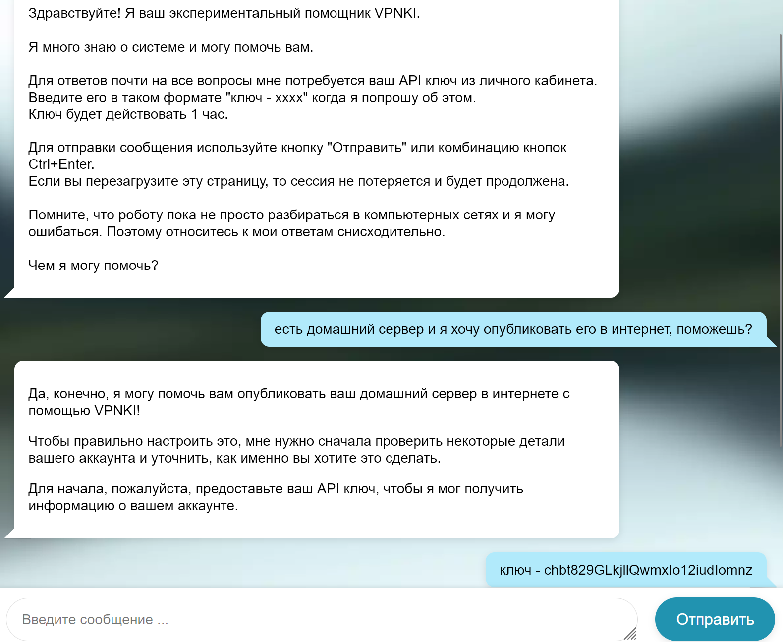 Для общения с ним вам нужно иметь API ключ VPNKI.